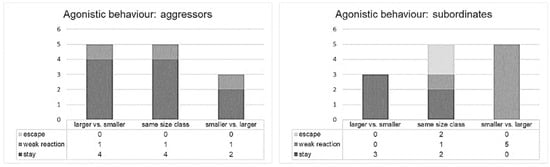 Reaction of aggressors and subordinates in the 13 recorded agonistic events, according to the size of the involved individuals.