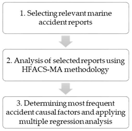 The research was divided into three phases: 1. selecting marine accident reports, 2. analysis of selected reports using HFACS-MA methodology, and 3. determining most frequent accident causal factors and applying multiple regression analysis to find which factors could be used as predictors of marine accidents (Figure 1).