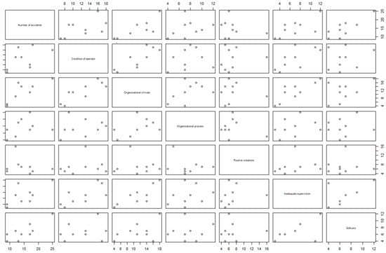 Each scatterplot in the matrix presents the relationship between a pair of variables, enabling many relationships to be visualized in one chart. The individual variables are shown in a diagonal line from top left to bottom right. Then each variable is plotted against each other. For example, the third box from the left in the sixth row is an individual scatterplot of Organizational Climate and Inadequate Supervision, with Organizational Climate as the X-axis and Inadequate Supervision as the Y-axis. This same plot is reproduced in the second box from the right in the third row. Basically, the boxes on the upper right side from the scatterplot’s diagonal line mirror the lower left side plots. The scatterplot diagram matrix shows the inconclusive explanatory effect of some individual variables, and there is a need to continue with further testing of the initial model with six explanatory variables. As the goal of the research is to obtain an accident number prediction model dependent on HFACS-MA contributory factors, it is necessary to determine if there is a significant relationship between the dependent and explanatory variables, and the following null hypotheses have been tested: H0: β1 = β2 = β3 = β4 = β5 = β6 = 0 at α = 0.05. Table 5 depicts the results of the multiple linear regression test in R.