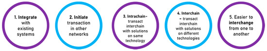 Figure 4). In the first stage, blockchain is able to integrate with existing legacy systems. Second, blockchain is able to initiate transactions with other networks. Third, one blockchain is able to interact with other blockchains of the same technology, e.g., a Hyperledger-based blockchain to do a transaction with another Hyperledger-based blockchain. Fourth, a blockchain (e.g., Hyperledger-based) is able to interact with a different type of (e.g., Ethereum-based). In the final stage, a blockchain is interchangeable with any other blockchain.