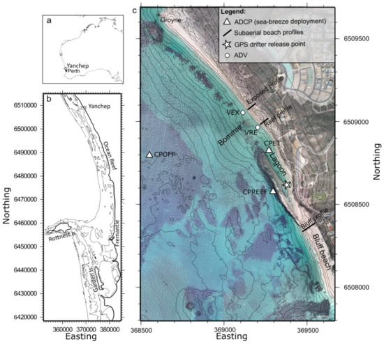 Geologically controlled beaches are a common feature of the Western Australian coastline. In the Perth region, the Pleistocene Tamala Limestone outcrops on the inner continental shelf as a series of discontinuous ridges (Figure 1b). The furthest ridge outcrops 20 km offshore and forms Rottnest and Garden Islands (Figure 1b). The inshore ridge coincides with the shoreline and has highly variable alongshore topography. This creates a diverse geological framework that supports a diverse range of beaches. The reef at Yanchep (Figure 1c), located 60 km north of the city of Perth, varies alongshore in elevation, continuity and distance seaward from the beach. This makes this relatively short, 3 km stretch of coastline an ideal location to investigate how rock topography influences beach morphodynamics. The beach on the southern section (bluff beach), is perched on a sub-horizontal limestone platform (the bluff) that reaches 0.4 m above mean sea level. Heading north, the reef outcrop is further from the coast constricting a narrow lagoon. North of the lagoon, the limestone becomes patchier forming isolated submerged rock outcrops (“bommies”) that cause waves to break outside of the surf zone. Further north, the reef is still present a few meters below mean sea level, intermittently buried in the sand. The northern limit of the beach is marked by a larger reef outcrop and a groyne installed in 1971 (Figure 1c). Gallop et al. [2,13] investigated the response of Yanchep to erosive events by observing the evolution of three beach profiles to strong sea breeze and storm events. Despite the profiles being only several hundred meters apart, the magnitude and timing of erosion and accretion varied greatly. However, with the spatially limited field measurements and limited measurements of the hydrodynamics, it was not possible to get a full understanding of the mechanisms of geological control that resulted in these differences.