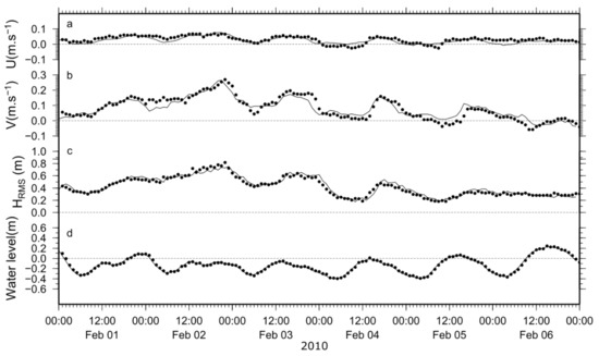 Simulated (line) and measured (dots) hydrodynamics parameters for the CPREEF site (See Figure 1c for locations. (a) cross_shore current; (b) alongshore current; (c) root mean square wave height; and (d) water level.