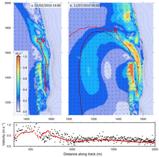 Global Positioning System (GPS) drifters (see Johnson et al. [42] for a description of the drifters) were released in the lagoon during both field experiments. The complex circulation and velocities measured by the GPS-drifters are resolved in the model simulation (Figure 6). In particular, during the July 2010 winter storm deploy, the release of the drifters corresponded to the relatively short time when the jet turned south after exiting the lagoon. The simulated velocity along the track of the drifters corresponds to the measured velocity with skill of 0.66. The discrepancy was mostly because the drifters measured velocities near the surface whereas the simulations were depth-averaged velocities.