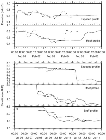 During the sea breezes and the storm event, beach elevations were measured on the subaerial beach only. The measured and simulated morphology changes were compared for the mean elevation in each profile (Figure 7). General trends in the morphology were relatively well captured for the seabreeze cycle at the exposed profile and the reef profile with skills of 0.77 and 0.68 respectively (Table 3). During the storm, three subaerial beach profiles were monitored. The elevation of the beach at the reef profile and the bluff profile was simulated with skill levels of 0.85 and 0.87, respectively (Table 3). The lower part of the exposed profile eroded rapidly; hence, data were only available for the upper part of the profile. The model simulated the elevation of the upper profile with a skill level of 0.59 (Table 3).