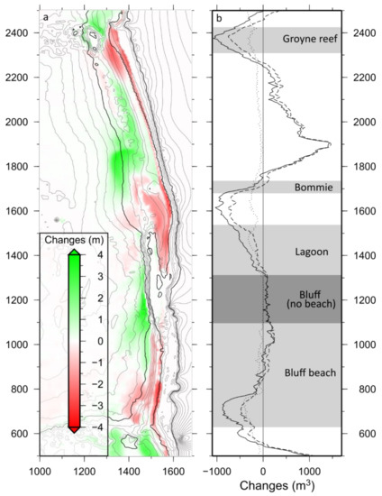 Simulated morphological changes after the storm: (a) map of the total changes in elevation overlain with the initial beach elevation contours at 1 m spacing; the thicker contours represent –5 m 0 m and +5 m; (b) volume eroded from the beach profiles (plain line); portion of the erosion from the subaerial beach profile (dotted line) and portion of the erosion from the submerged beach profile (dashed line). The grey shading corresponds to areas of the beach that are fronted by reefs.