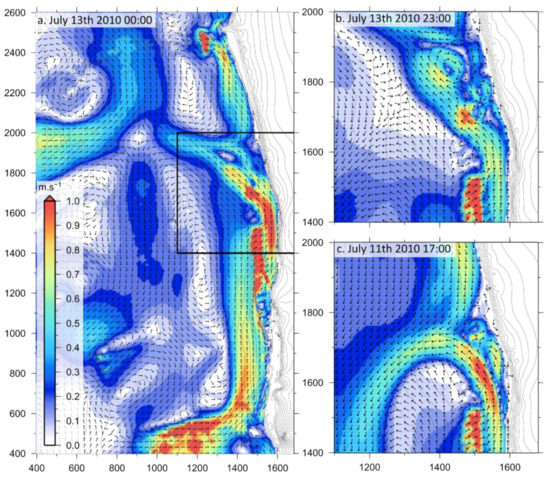 Major erosion occurred at locations near submerged reefs where the geologically controlled current jets reached velocities exceeding 1 ms−1 (Figure 8). During the majority of the storm duration, the area between the lagoon and the groyne was influenced by the jet generated by the reef seaward of the groyne and the jet generated within the lagoon. The direction of the jets depended on the shape of the reef but also varied with the meteorological and oceanographic conditions. For example, the lagoon jets flowed northward along the shore restricted region between the reef and the beach. When these jets exited the lagoon, it flowed directly westward on the 13 July 2010 at midnight, northward toward the Bommie on 13 July 2010 at 23:00 and southward on the offshore side of the reef on the 11 July 2010 at 17:00 (Figure 9a–c, respectively). Changes in the direction of the jet to the south are consistent to alongshore wind forcing which likely to dominate outside of the surf zone.