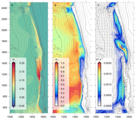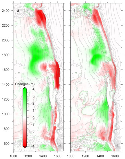 (a) Simulated morphological changes without considering an increased reef friction (both and ); (b) simulated morphological changes with the reef elevation lowered by 1 m.