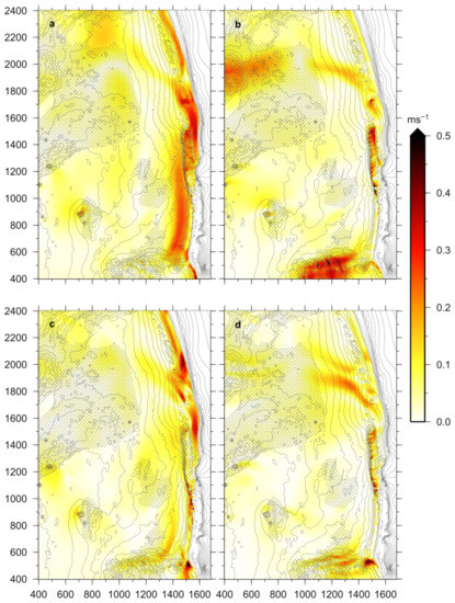 Sensitivity to of the simulated (a) alongshore; and, (b) cross shore currents and sensitivity to of the simulated (c) alongshore; and (d) cross shore currents. Hatched area indicates outcropping reefs.