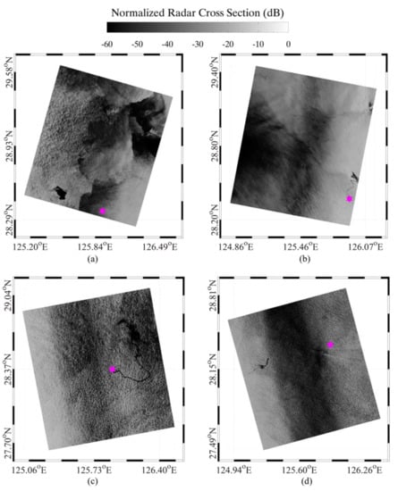 The quick-look maps of four Gaofen-3 (GF-3) synthetic aperture radar (SAR) images of the Sanchi shipwreck in 2018, in which the pinkish marks represent the shipwreck positions. (a) The image taken acquired in Fine Stripmap (FS) mode on 14 January at 22:20; (b) The image taken acquired in FS mode on 15 January at 21:39; (c) The image taken acquired in Stander Stripmap (SS) mode on 17 January at 09:42; and (d) The image taken acquired in SS mode on 18 January at 09:01.