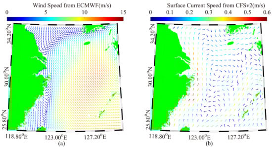 (a) The sea-surface wind map from European Centre for Medium-Range Weather Forecasts (ECMWF) taken at 00:00 on 16 January 2018; (b) The sea-surface current map from Climate Forecast System Version 2 (CFSv2) taken at 22:00 on 15 January 2018.