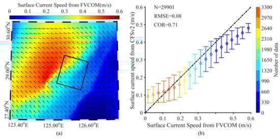 (a) The sea-surface current map from FVCOM taken on 14 January at 22:30, in which the black rectangle represents the spatial coverage of the corresponding GF-3 SAR image and the pinkish marks represent the shipwreck position; (b) The comparison between sea-surface current speeds simulated by the FVCOM and the CFSv2 data for a 0.03-m/s bin, in which the error bars represent the standard deviations of each bin for the matchups in the black rectangle in Figure 3.