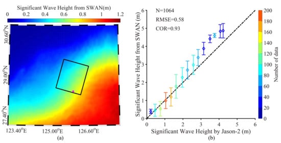 According to the wave theory, SWH is a typical variable representing the energy of wave fields. The SWH map taken on 14 January at 22:30 is presented in Figure 6a, in which the black rectangle represents the spatial coverage of the corresponding GF-3 SAR image and the pinkish marks represent the shipwreck position. The model-simulated SWH from SWAN is compared with the collocated measurements from the Jason-2 altimeter, as shown in Figure 6b. It was found that the RMSE of SWH was 0.58 with a 0.93 COR. Again, the under-estimation of SWH, as SWH greater than 1.5 m, was probably caused by the inherent error of ECMWF winds.