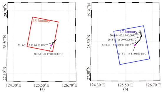 Since 1979, the ECMWF has continuously provided reanalysis wind data at 10 m above the sea surface with a 0.125° grid of spatial resolution at interval of 6 h each day, which is reliable for atmospheric and marine research. In particular, the ECMWF winds are popularly treated as the forcing field for running hydrodynamic models, such as FVCOM [] for current simulation and SWAN [] for wave simulation in this study. The case map of ECMWF wind taken at 00:00 on 16 January 2018 is shown in Figure 3a. The Climate Forecast System Version 2 (CFSv2) from the National Center of Atmospheric Research (NCAR) provided the sea-surface current data with about 50 km of spatial resolution, which was used for confirming the accuracy of the model-simulated currents from the FVCOM. Figure 3b shows the sea-surface current map from CFSv2 taken at 22:00 on 15 January 2018, in which the relatively strong current is clearly visible around the Zhoushan islands in the Yangtze Estuary. Similarly, the wave measurements from the Jason-2 altimeter were collocated with the model-simulated waves from SWAN in January 2018 in order to validate the model-simulated waves, although Jason-measured waves were available at the footprints following the satellite track, as shown in Figure 4, in which the pinkish marks represent the shipwreck position, and the black rectangle represents the available measurements for validating the model-simulated SWH from SWAN.