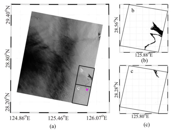 (a) The GF-3 SAR image on 15 January 2018 at 21:39, in which the pinkish marks represent the shipwreck position, and the sub-scenes b and c are used to extract spilled oil slicks; (b) The results of extracted oil slicks from sub-scene b, which are marked by black spots; and (c) The results of extracted oil-slicks from sub-scene c.