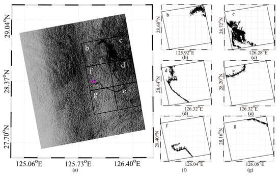 (a) The GF-3 SAR image on 17 January 2018 at 09:01, in which the pinkish marks represent the shipwreck position, and sub-scenes b through g are used to extract spilled oil slicks; and (b) to (g) The results of extracted oil-slicks from sub-scenes b to g, which are marked by black spots.
