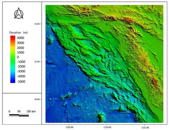 Overall, the municipality of Ensenada occupies a territory of 19,538 km, with a population of more than 500,000 inhabitants. The port of Ensenada is located within the Todos Santos bay, which has an approximate area of 180 km. This bay is characterized by the presence of an underwater canyon to the southeast that gives the bathymetry the shape of a river valley with depths that change abruptly from 50 m to 390 m. Figure 2, shows the bathymetry of the study area, which is irregular and has numerous islands and islets, in addition it presents abrupt variations in the slopes. The seabed has maximum elevations of 700 m in the islets and depths of up to approximately 4250 m at distances of 360 km from the coastline.