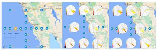 The methodology proposed in this work is based on a 21 years (1998–2018) ERA5 global reanalysis dataset [] provided by the EMCWF (European Centre for Medium-Range Weather Forecasts). The choice of this dataset is based on the results of a recent study by [], which compares five global reanalysis database with observations. Ramon et al. (2019) identifies ERA5 as the one that best represents the wind speed features and in particular near-surface winds. The meteorological variables at stake (surface pressure, horizontal and vertical velocity components at 10 m) were downloaded for all points of the 0.25 degrees resolution grid in the study area, corresponding to approximately 25 km (Figure 3a). Wind roses show the direction towards with the wind blows.