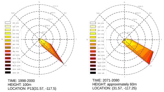 In order to check how winds are expected to change in the future in the study area, we compared the wind roses of the long-term pressure and wind data series of two time periods: 1998–2020 (similar to the one used to estimate the TMY in this study) and 2071–2080 decade, for which climatic projections are available within the CESM1 CAM5 large ensemble []. This dataset, based on the RCP8.5 forcing scenario (http://www.cesm.ucar.edu/projects/community-projects/LENS/, accessed on 10 October 2020), contains atmosphere 6-hourly post-processed data (pressure and wind speed horizontal components) at different sigma levels, the lower being approximately 60 m over sea level. Figure 4 shows the comparison between the long-term wind roses for the two time periods considered. The plot is produced for point P13 at 100 m height (left) and in the proximity of point P13 at approximately 60 m height (right) for the present and future time periods, respectively.