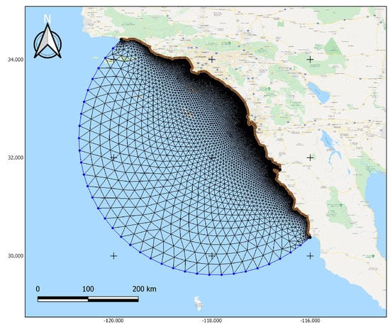 The study area was discretized with an unstructured mesh (Figure 5) to obtain levels of spatial resolution in the different zones of the spatial domain. After preliminary tests to evaluate the effect of the mesh size on the results, an unstructured triangular mesh of 19,742 elements was generated, which consists of a total of 10,327 nodes, with a minimum space between nodes of 900 m, near the coastline, and a maximum space of 27,500 m in open sea.