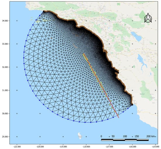 Figure 5 shows the delimitation of the computational domain: the red line defines the limit of the coast, while the blue line is the domain limit in the open sea. The study area covers the coastal region of Ensenada and is located within the polygon defined by the points 35.00 N, 28.75 S, −115.00 E, −121.25 W. In order to construct the geometry and the computational mesh, the Digital Elevation Model (DEM) of the Ensenada port was used. The DEM was developed by the General Bathymetric Chart of the Oceans [], a global terrain model for the ocean and the earth, with arc intervals of 15 s.