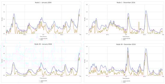 The analysis of the distribution of the most representative wave parameters (significant wave height and peak period) was carried out on the basis of 490,650 records, which represent one record every hour for 365 days, for the 56 “virtual buoys” shown in Figure 6. To verify simulation results, we compared the significant wave height values calculated with the SWAN+ADCIR model with the values present in the ERA5 database (https://cds.climate.copernicus.eu/#!/home, accessed on 23 February 2021). The comparison was made on nodes 1 and 30 (far south and center of our line of virtual buoys), for the twelve months of the TMY. For practical reasons, in Figure 7 we show only the comparison between the calculated values and those of the dataset for the months of January and December.