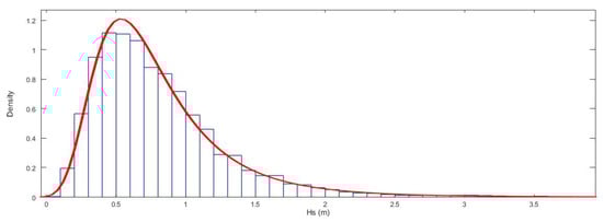 The characteristics of the variation of the significant wave heights () throughout the year, were studied using the frequency distribution of this parameter. Figure 8 shows the frequency histogram of the occurrence.