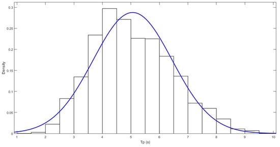 This distribution can be described by a normal probability density function, which gave a mean value of 5.1 s and variance 1.9. Maximum and minimum values (9.8 s and 1.3 s, respectively) are found to be lower than the ones estimated by []. In the aforementioned statistical analysis, the authors used wave values recorded between September 1986 and August 1987, in a station located at the Todos Santos bay. Since the wave period is an extremely variable value that depends on the sea-state, frequently characterized by the coexistence of the local wave system and the background swell, we consider that the one year used in [] is a statistically short period that can not take into account all the variations to which the wave period is subject, and probably reflects only local effects.