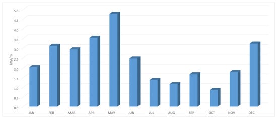 To calculate the wave energy, Equation (5) was applied to all 56 nodes selected as virtual buoys. The calculations were performed using the results obtained from the wave height and period simulations, for each hour of the 365 days of the TMY, obtaining a total of more than 490,000 energy potential results. The calculated annual energy average produced by wave motion is 2.4 kW/m. Figure 10 shows how the availability of energy varies during the months of the year.