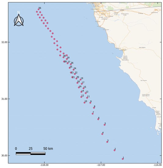 According to [], there are some aspects to be considered for the definition of sites for the use of ocean energy, which also include external factors such as navigation activities, fishing, recreation, underwater research, military activities. For this reason, it is important to mention that the coast of Ensenada is characterized by the presence of a protected natural area, El Estero de Punta Banda, which was designated, in 1995, as an ecological preservation area. In addition, the port of Ensenada has an anchorage area for merchant and cruise ships, as well as nearby areas for commercial and sport fishing. To take these aspects into consideration, and in line with the maximum distances reached by power cables [], in this work the analysis of wave characteristics and the consequent potential energy calculation, is performed at a distance of approximately 100 km from the coast line.