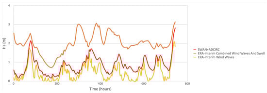 The results of the calculation of energy that can be extracted from the wave motion along the coast of Ensenada, reveal that the area can be considered to have a low energy potential, having obtained an annual average of 2.4 kW/m. However, energy peaks of 5 to 10 kW/m were calculated in the months of April and May particularly, in accordance with the results of the research by [] where it is concluded that along the coast of Baja California it is possible to achieve a wave power of the order of 2–10 kW/m. A discrepancy with the work cited can be seen for the months in which the energy is more persistent. The authors indicate that the months with the greatest potential are from October to April, while, in this work, we observe that October is the least productive month and, among the months of greatest production we also include May and June. In addition, they calculate longer persistence times than those calculated in this paper. This difference can be explained by considering the two different methodological approaches used. For the estimation of the energy potential, in [] the authors use the ERA-Interim database (http://apps.ecmwf.int/datasets/data/interim-full-daily/levtype=sfc/, accessed on 20 November 2020), where significant wave heights are available as a combined value of the swell component plus the component due to the effect of the wind, but also as wind heights only. Figure 12 shows a comparison between significant wave heights available in the ERA-Interim database and values calculated in this work with the SWAN + ADCIRC model, for January 2004 (our TMY’s first month), in the same point considered by [] for their calculations in the Baja California sea. The significant height values we calculate are lower than the heights obtained as a combined effect of the swell plus the local wind, however, they fit well with the ERA-Interim wind wave heights.