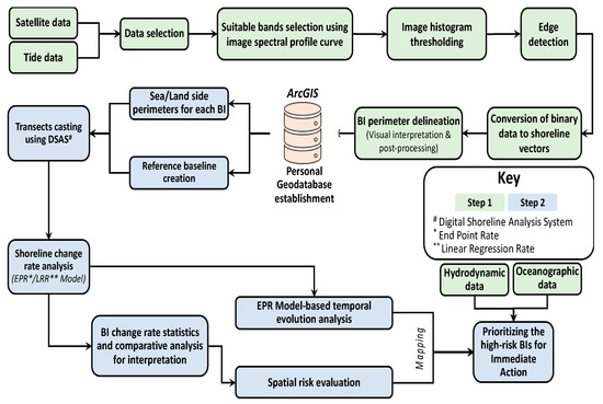 The research work was performed in a series of steps, from data acquisition to data selection, pre-processing, shoreline delineation, change rate analysis, and mapping. For simplification, we divided the overall workflow into two steps. The first step consisted of data acquisition, selection, pre-processing, and perimeter (shoreline) delineation for each BI. The second step included an assessment of changes in the shorelines of each BI during the period 1989-2018 using the transect-based method in the Digital Shoreline Analysis System (DSAS). The DSAS is an ArcGIS tool developed by the USGS and is widely used in coastal assessments to aid policy and decision making in the context of coastal management [15,46]. The spatial assessments were performed to provide a geographical reference and information for the prioritization of different BIs for immediate or gradual measures. The details on the two steps are provided in the following sub-sections.