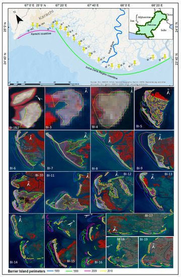 To check the accuracy of the results, the vector shoreline representing the boundary of each BI was examined with the corresponding false-color combination (bands 2, 3, 4 for TM, and 3, 4, 5 for OLI 8) of Landsat images. This overlay analysis helped us visually verify the alignment of the BI perimeters with the seaward edge of vegetation representing BI boundaries on Landsat images and to ensure the quality/reliability of the results, as practiced by Sajjad et al. [7]. BI-wise visual assessment also enabled us to identify which islands are experiencing disintegration and where new sandbars/BI-segments are appearing over time.