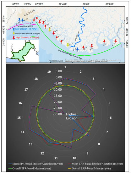 The results from this study have important implications relevant to decision making and policy formulation for better coastal planning and designing conservation strategies to reduce erosion and protect the BIs in Pakistan. For example, the BIs experiencing high erosion (categorized in the highest erosion group, erosion > 2 m/y) must be prioritized for appropriate measures. They should be considered in the process of coastal planning and development projects [28]. Otherwise, defense measures against climate change remain unproductive. The localized transect-based information of erosion/accretion rate provided in this study, which is not presented by Waqas et al. [33], is vital for local actions and decision making in the context of the long-term sustainability of coastal areas in Pakistan. These localized findings on coastal erosion can be used to scale down the study area and combined with other datasets (e.g., population, infrastructure, and natural systems) for further detailed analysis, such as the risk/vulnerability assessment of coastal communities to coastal erosion, which could progressively contribute towards coastal sustainability in the wake of global environmental change [62,63].