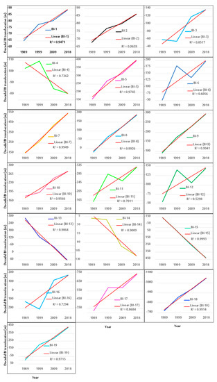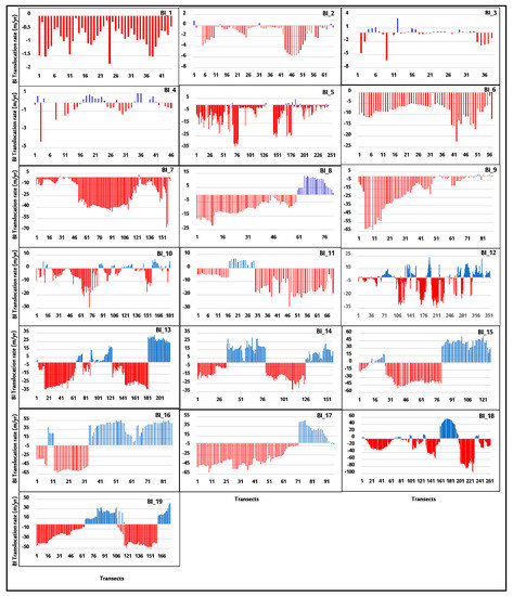 To quantitatively assess the vulnerability of the shorelines to erosion in the study area, we adopted a relatively simple but robust classification scheme from Gornitz et al. [48] and divided the BI change rate statistics into 5 classes (i.e., >+2.0 m/y, +1.1 − +2.0 m/y, −1.0 − +1.0 m/y, −1.1 − −2.0 m/y, and <−2.0 m/y). This categorization helped us to prioritize the BIs for immediate or gradual actions and measures, where needed. A quantified histogram map of erosion/accretion intensity was produced for each BI. The interdecadal migration of the Bis was further analyzed using the historical trend of the changes in the BI perimeter distance from the reference baseline (year 1989).