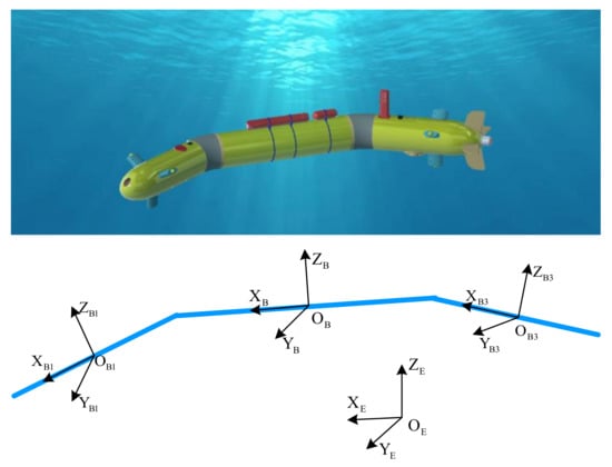 The MJ-AUV is a multi-rigid-body rootless system with high nonlinear and strong coupling characteristics, the kinematic and dynamic modeling of which is the basis of studying its motion behavior characteristics and control problems. Xia et al. [5] established a horizontal dynamic model of a fish-like robot based on Kane’s method. Aiming at the structure of the underwater gliding snake-like robot, Tang et al. [6] built a gliding and serpentine swimming model based on the momentum theorem, moment of momentum theorem, and recursive Newton–Euler method. Based on the principle of force and moment balance, Kelasidi et al. [7,8,9] built a horizontal plane and slope dynamics model of the underwater snake robot in the inertial system. In addition, the Euler–Lagrange method [10] and the Schiehlen method [11] have also been used to deal with multi-rigid body modeling.