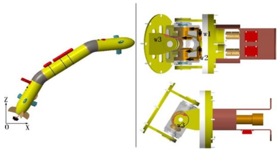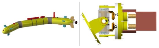 Most of the existing deep-sea submersibles struggle to meet the capabilities necessary to explore deep-sea hybrid structures rapidly. The glider [2,3] achieves pose control by adjusting the remaining buoyancy and the position of the mass center, but its motion trajectory is jagged and single, speed is slow, and maneuverability is poor. Most autonomous underwater vehicles (AUVs) [4] are rigid single-body structures and use tail rudder and attitude adjustment systems to control the movement direction. In order to further improve the ability of flexible steering of the AUV to allow rapid observation of the deep-sea 3-dimensional (3D) environment, a multi-joint AUV (MJ-AUV) was designed. It consists of three parts in series: diversion cabin, navigation/control cabin, and propulsion cabin, each of which is connected by a pair of orthogonal joints. In addition, its tail is equipped with a propeller. To adjust the yaw attitude and pitch attitude of the body, the MJ-AUV can change the hydrodynamic appearance of the vehicle by rotating the joints.