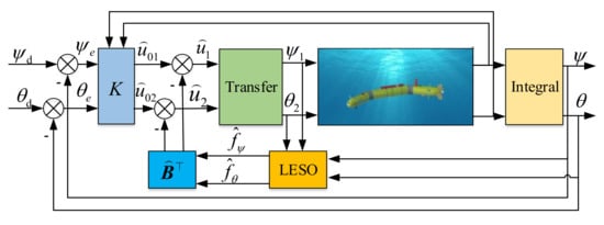 The remainder of this paper is organized as follows. Section 2 establishes the 3D motion model of the MJ-AUV. The LQR decoupling control method based on LESO is presented in Section 3. In Section 4, the pitch and yaw control of the MJ-AUV is simulated on the MATLAB/SIMULINK platform, followed by the conclusion in Section 5.