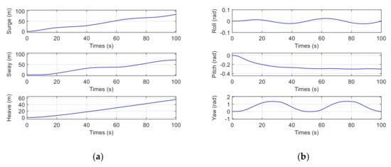 The initial states of the MJ-AUV are , , , , , and . In addition, the controller parameters are , , , , , , , and represents the diagonal matrix. The control gain after LQR optimization is