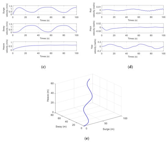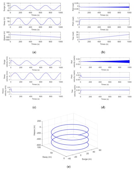 The above simulation results are consistent with the common physical phenomena, and to a certain extent, it can be considered that the established MJ-AUV 3D dynamic model is reasonable, without loss of generality and reliability. According to the simulation results, compared with the single rigid body AUV, the MJ-AUV has stronger flexible maneuvering characteristics and can perform more complex movements, such as large angle pitching movement, small radius steering movement, spiral ascending and diving movement, and so on, which satisfies the design intention.
