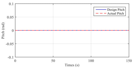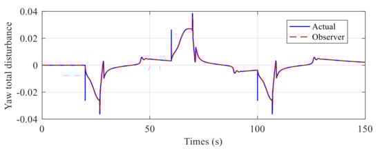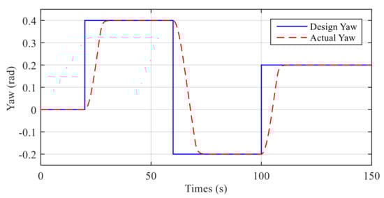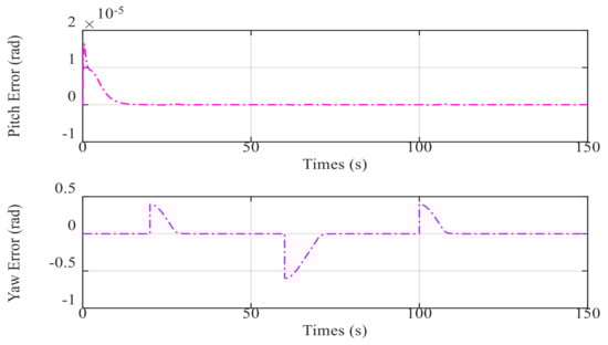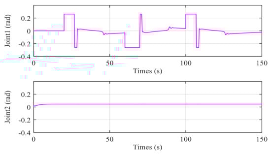 Figure 8, Figure 9, Figure 10, Figure 11 and Figure 12 show the simulation results of the pitch and yaw attitude control of the MJ-AUV, that is, when the pitch attitude is kept as 0 rad, the yaw attitude is adjusted according to the design signal. Figure 8 shows the pitch control results. The reason why the initial pitch attitude is not 0 rad is that the rest buoyancy of each cabin of MJ-AUV is positive, and the resultant moment of the body is not 0 rad. In other words, when the joint angle is 0 rad, the pitch attitude of the body is not 0 rad, so it is necessary to adjust the body attitude to 0 rad by adjusting the joint angle, which can also be seen from the performance of joint 2 in Figure 11. Figure 9 and the performance of joint 1 in Figure 11 show that, the yaw subsystem can be adjusted quickly after encountering multiple step signals, and the overshoot quantity is nearly 0 rad, with a very smooth transition process. Figure 10 shows that the maximum control error is within 0.005%, verifying that the designed controller has a high control accuracy. Figure 12 shows the observer’s estimation results for the total disturbance of the pitching and yaw subsystem. The results show that the estimated value of the total disturbance can follow the real value in real time and accurately, further proving the effectiveness of LESO and making a great contribution to the control of the disturbance compensation.