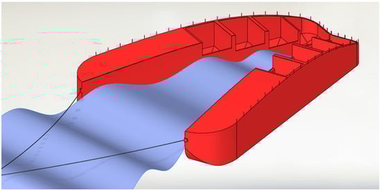 36]. Waves impinge at an angle along its inner hull before cascading into reservoirs. Two symmetrical hulls are connected via a hinge at the stern of the device, allowing the relative angle between the two hulls to be varied during operation. The draft and trim of the device can be varied through the use of ballast tanks, allowing the device to adapt to seas states and tune the freeboard to spread overtopping volumes across the device collection tanks. The collected water is exhausted through low-head turbines in the base of the tanks to generate electricity. The overall length of the planned prototype is 90 m and it is intended to operate in water depths of 50 m to 100 m. The distance of the device offshore, coupled with the devices low profile will limit visual impact compared to offshore wind farm. The device is intended to be moored via a single point to the seabed, using a Catenary Anchor Leg Mooring (CALM). This allows the device to orient itself along the direction of wave propagation passively, reducing the need for complex systems devoted to maintaining device direction. The survivability of the device is closely linked to the wedge angle (