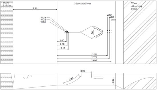 Figure 4 shows the plan view of the moorings and wave gauges, above, and the lateral view of the moorings, below. The line from floor to float is 3.8 m long and allowed to rest at equilibrium. The two lines from float to model are 3 m long each. Three wave gauges are placed between the model and wavemakers and three further wave gauges behind the model to capture transmitted waves. Wave gauges 1, 2 and 3 are located between the model and wavemakers and wave gauges 4, 5 and 6 are located between the model and beach. All wave gauges are positioned along the centerline of the model.