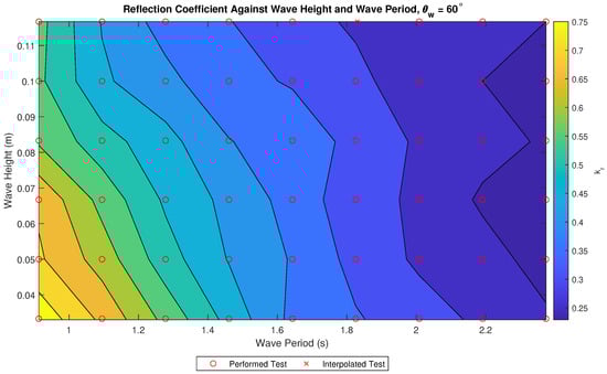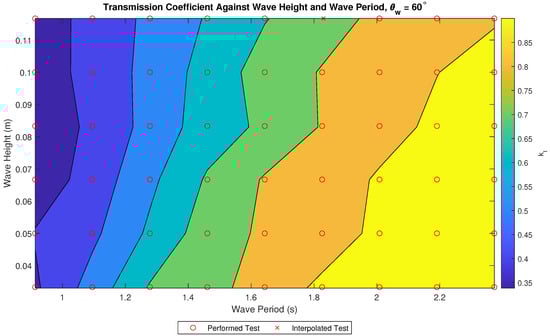Using the spectral data from each test, the significant wave heights of incident, reflected and transmitted waves were calculated over the course of a complete test and converted to a coefficient using the method detailed above. Note that for test conditions of = 0.12 m and = 1.83 s it was discovered that file corruption caused data loss for the surface elevation data. When plotting the tests by period it was observed that the tests of other wave heights were of a linear relationship around a wave period of 1.83 s, therefore the data point was linearly interpolated using the tests of the periods either side of the missing result at the same wave height. The interpolated result has been highlighted on all following results.