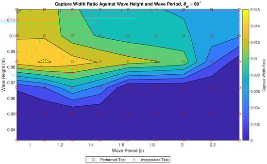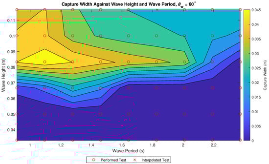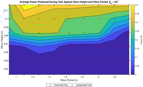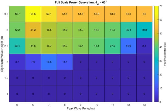 Figure 11 shows the power estimation of the WaveCat during tests, with yellow representing high power and blue low power. The average power during a test was calculated from the total collected energy during a complete test, Equation (