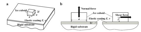 We investigated the interface debonding of an ice cuboid (square-based, size: a × a × 2l) from an elastic coating which is perfectly bonded to a rigid substrate under normal and shear loading as shown in Figure 1a,b. The ice cuboid can be regarded as a rigid body because of the large difference between the elastic moduli of ice and the elastic coating. The thicknesses, elastic modulus, and Poison ratio of the coating are, respectively, t, E, and v. The adhesion energy of the interface is Wad; this is the energy per unit area required to separate the ice cuboid and coating. The normal or shear concentrated force is applied to the centroid of the ice cuboid.