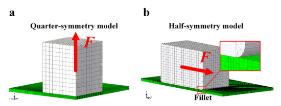 In this study, 3D FE simulation was performed using the commercial FE software ABAQUS. The ice cuboid is modeled by a square-based rigid cuboid. It is treated as a discrete rigid body using a 3D rigid quadrilateral element (R3D4). The side length of the square is 25 mm. The height of the cuboid is 15 mm. The elastic coating is modeled by an isotropous elastic film using 3D linear full-integration hexahedral element (C3D8) with material properties v, E, and t. The values of t are set to 0.25, 1, and 5 mm (t/a = 0.01, 0.04, and 0.2); v is 0.3. Since we are mainly concerned with the effect of the elastic modulus E on Fc, the range of E is chosen to be 0.2 to 10,000 MPa. The size of the coating is 50 mm × 50 mm. The coating is bonded to a rigid substrate (perfect bonding, no debonding and no slip), so that a fixed boundary condition is set for the bottom surface of the coating. Displacement control normal or shear force is applied to the center of ice cuboid. The critical detachment force (Fc) can be obtained by reading the maximum force (Fmax) of the displacement–reaction force curve. A bilinear cohesive zone model (CZM) [24] was used to simulate the interfacial interaction between the ice cuboid and the elastic coating. A static implicit solver was used. Quarter-model and half-model were used for the normal separation and shear separation, respectively, to reduce the amount of calculation, taking advantage of the symmetry of geometry and loading, as shown in Figure 3a,b. Therefore, Fc = 4Fmax and 2Fmax for normal and shear separation, respectively. To prevent stress singularity and element distortion under shear loading, a 90° fillet with a radius of 0.5 mm was set at the edge of the cuboid. A total of 10 nonuniform seeds are set at the fillet (bias ratio is 5) (see inset in Figure 3b).