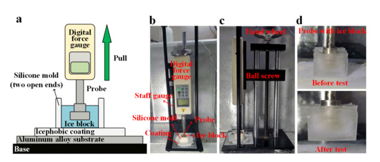 The ice tensile adhesion strength (σice) test apparatus is shown in Figure 5a–d. First, the coated aluminum alloy substrate was fixed on a base with 4 screws in a refrigerator at −10 °C). A silicone mold with two open ends (cavity size: 25 × 25 × 20 mm) was put on the coating. A probe was connected to a digital force gauge, which was fixed on a hand-driven ball screw (see Figure 5c). The distance between the probe and coating surface was adjusted to ~4 mm by the ball screw. Deionized water was dripped onto the silicone mold to a depth of about 1–2 mm by a dropper. The water surface tension prevents water from getting out of the gap between the mold and coating surface. After the water of 1–2 mm depth was frozen, another 13–14 mm depth of water was dripped. Two hours later, the probe was frozen into an ice block (25 × 25 × ~15 mm). Because the force is applied normally, the height of the ice block has no effect on σice. The normal force was applied by slowly turning the hand wheel of the ball screw (see Figure 5c). Figure 5d shows the probe with the ice block before and after the test. The maximum force (Fmax) at separation can be read on the display of the digital force gauge, and σice can be calculated using σice = Fmax/A (A is adhesion area, 25 × 25 mm2). Five equally coated substrates were tested for each coating to obtain the average and standard deviation of σice.