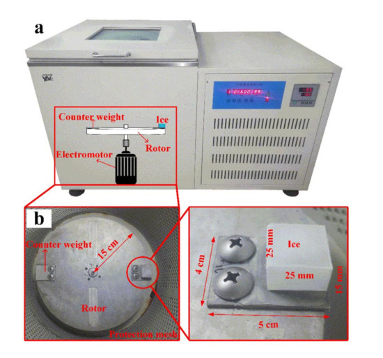 Ice shear adhesion strength (τice) was measured by a centrifugal adhesion test, as described in our previous work [25]. Photographs of the refrigeration centrifuge and centrifuge test setup are shown in Figure 6a,b. The ice cuboid (25 × 25 × 15 mm3) was frozen onto a coated aluminum alloy substrate by using a silicone mold at −10 °C. The substrate with ice was bolted to the rotor (radius 15 cm). With an increase of rotation speed, the centrifugal force overcomes τice. Then, the ice detaches from the coating and impacts the protecting mesh. The rotation speed in rpm was recorded. Fmax can then be calculated using the centrifugal formula (Fmax = mω2r, where m is the mass of ice and r is the centrifugal radius) using SI units. Then, τice = Fmax/A. Five equally coated substrates were tested for each coating to obtain the average and standard deviation of τice.