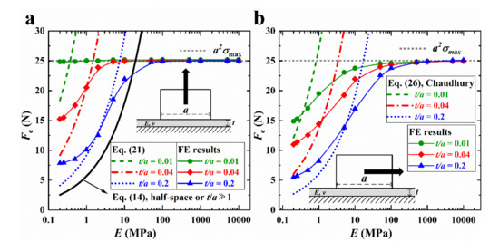 For normal separation, Equation (14) (case with half-space k = 0.4265) and Equation (21) (case with film) are also plotted in Figure 7a. It can be seen that Equation (21) agrees well with the simulation results for low E and thick films (t/a = 0.04 and 0.2). For t/a = 0.01 and a large E (>~10 MPa), Equation (21) cannot match the simulation results. The Fc results of Equation (21) increase rapidly with E and extend to infinity.