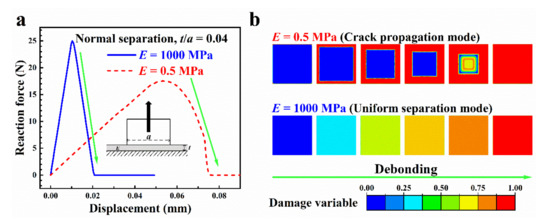 The interfacial debonding mode differs for low and high E. Force–displacement curves during detachment for normal separation, for E = 0.5 and 1000 MPa, are shown in Figure 8a,b. For E = 0.5 MPa, when the reaction force reached near Fc, cracks began to appear at the edge of the interface and extended to the interior until the ice cuboid separated completely (see Figure 6b, E = 0.5 MPa). This interfacial debonding behavior can be regarded as a crack propagation mode. For E = 1000 MPa, there is no crack propagation during the whole detachment process. The damage variable distribution in the whole interface is then almost uniform (see Figure 8b, E = 1000 MPa). This interfacial debonding behavior can be regarded as a uniform separation mode. These two kinds of interfacial debonding behavior were also observed in Peng’s work [15] for large and small values of t.
